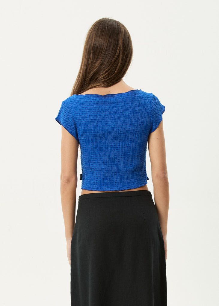 Our best selling seersucker top returns in Marina. Crafted from a breathable hemp and tencel blend, this cropped style is designed with a wide neckline and cap sleeves for a relaxed yet flattering fit. Finished with delicate baby lock edges for refined detail.