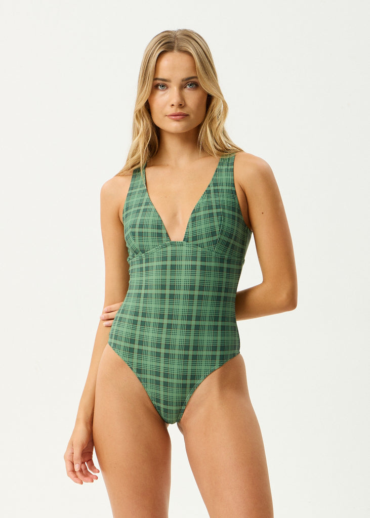 The 'Lonnie' swim collection introduces our hunter green check across classic swim cuts. This one piece is designed with a tight fit, cheeky cut, v-neckline, and a square scooped back.