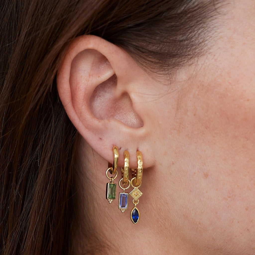 The Baguette Earring Charm features a stunning hand cut stone held securely in a delicate bezel setting with signature ball detailing at the bottom.