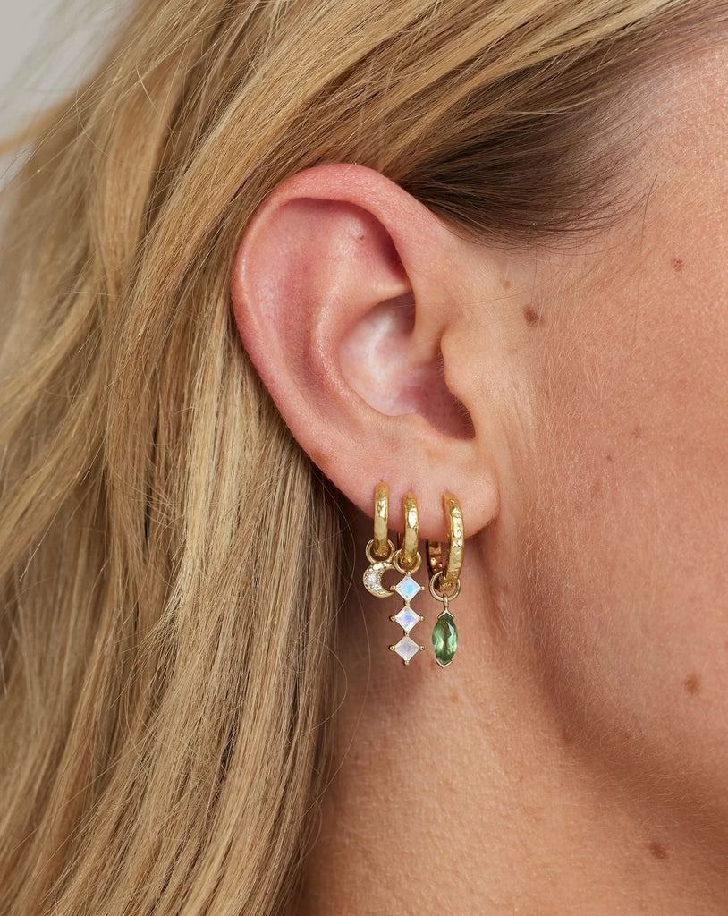 The Moon Charm is a delicate earring charm that features a small cubic zirconia set within its hammered textured detail. The charm is fixed on its hoop.