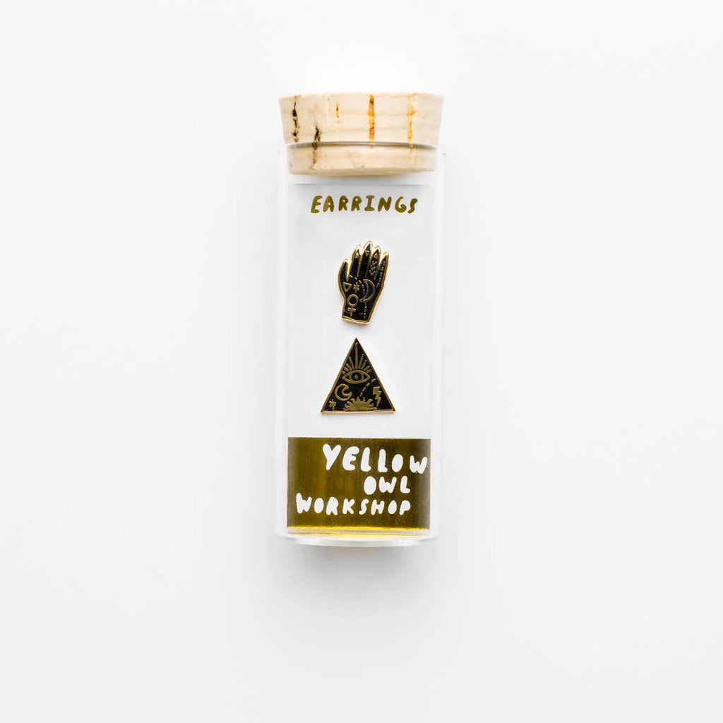 Presented in our original glass vial packaging these unique earrings blend a sense of gold glamour with a charming twist. The mismatched yet perfectly paired cloisonné petite studs are gilded in 22 karat gold and have hypoallergenic posts.