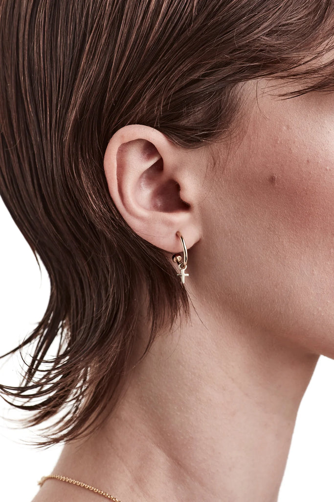 The Stolen Cross Anchor Sleepers are crafted from a solid sterling silver base and coated in 1.5 microns of 18k yellow-gold. This pair of beautiful drop earrings feature delicate cross charms suspended on Stolen's classic hoops and secured with a butterfly closure.
