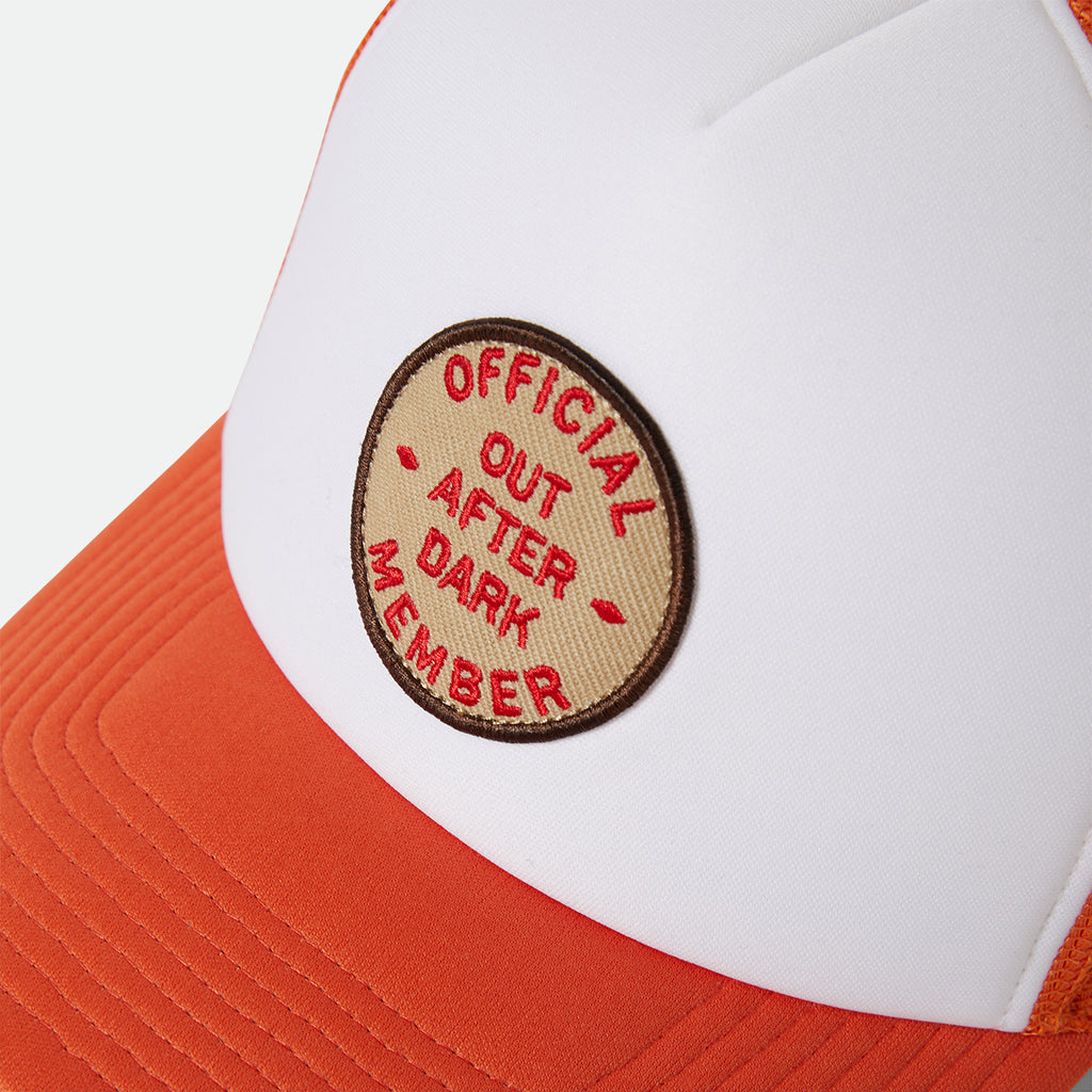 Bold style meets all-day function in the Brixton Out After Dark Trucker Cap. Featuring a high-profile, structured 5-panel design with a curved bill and foam front, this standout cap brings vintage trucker vibes in a vibrant tangerine/off-white colorway.