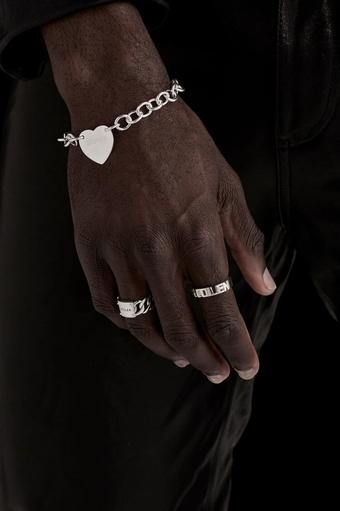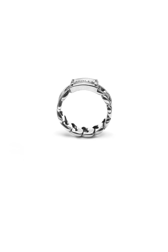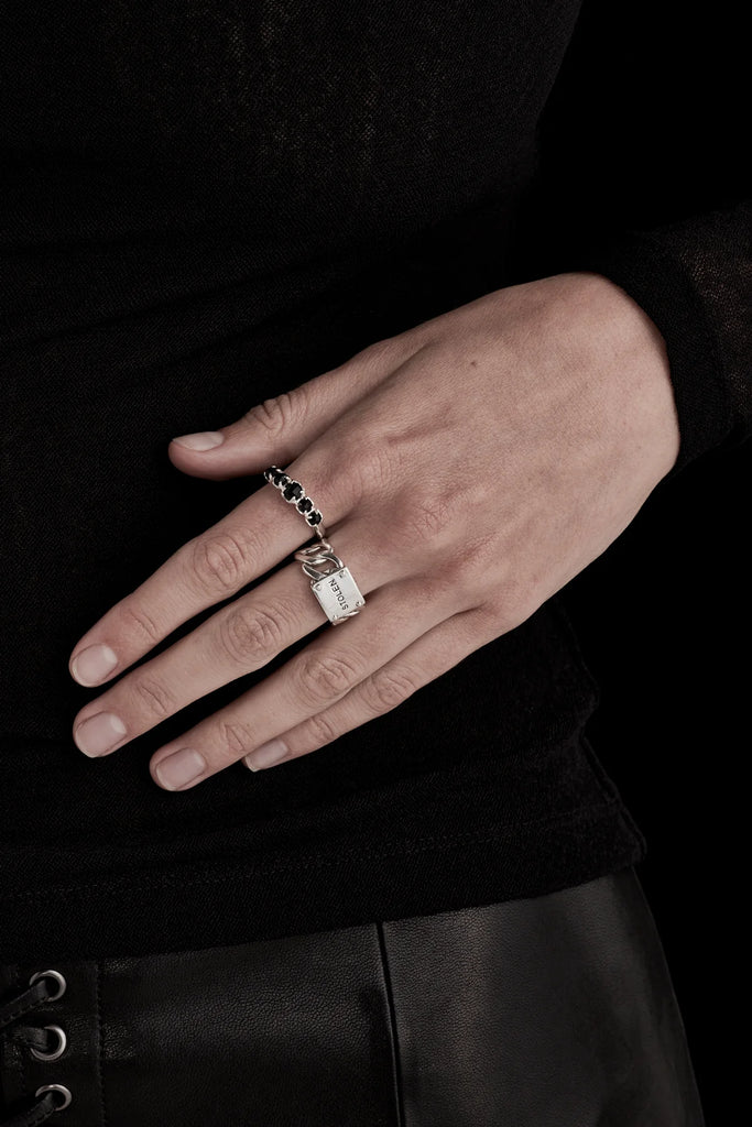 Stolen's timeless chain ring in a wider band. The Curb Ring by Stolen Girlfriends Club is made from solid sterling silver and features sculpted chain detailing with a branded face plate. Designed to make a statement on it's own or to be worn stacked.