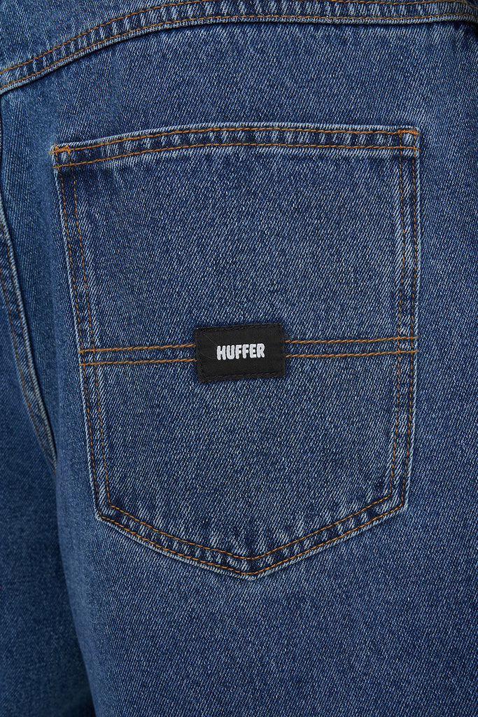 • What you need to know: 100% Cotton 12oz denim, Relaxed streetwear fit, Fixed waistband with fly and button closure, Hammer loop, Front side angle pockets, Side leg patch pocket, Huffer branded woven label.