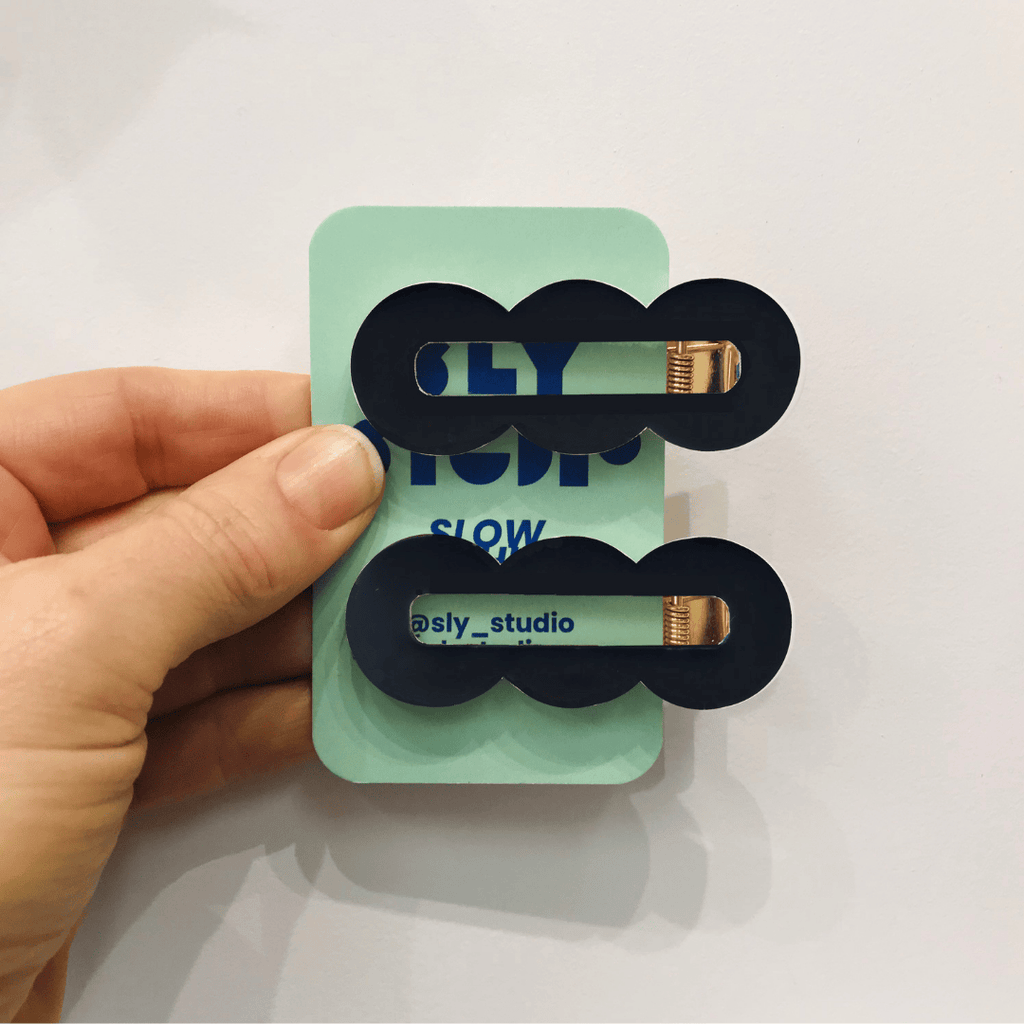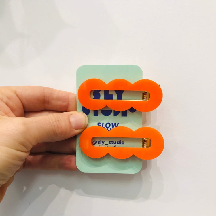 Unleash your inner artist with our bright, bold abstract hair clips, inspired by the vibrant shapes often found in Memphis design. Comes in a set of two with an alligator back, super strong grip, made from acetate and measuring approximately 2.5cm wide and 6.5cm long