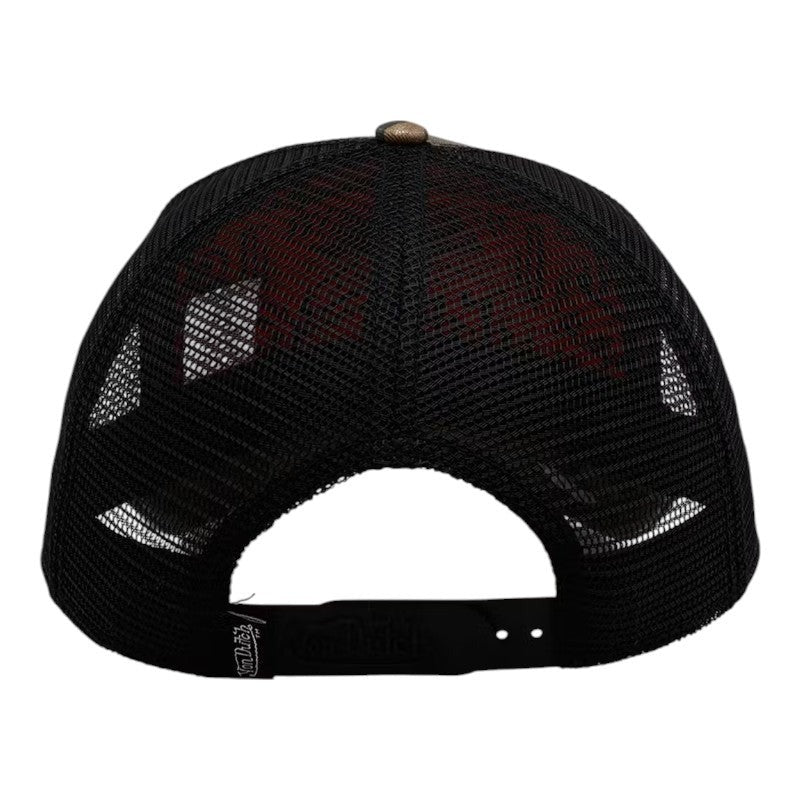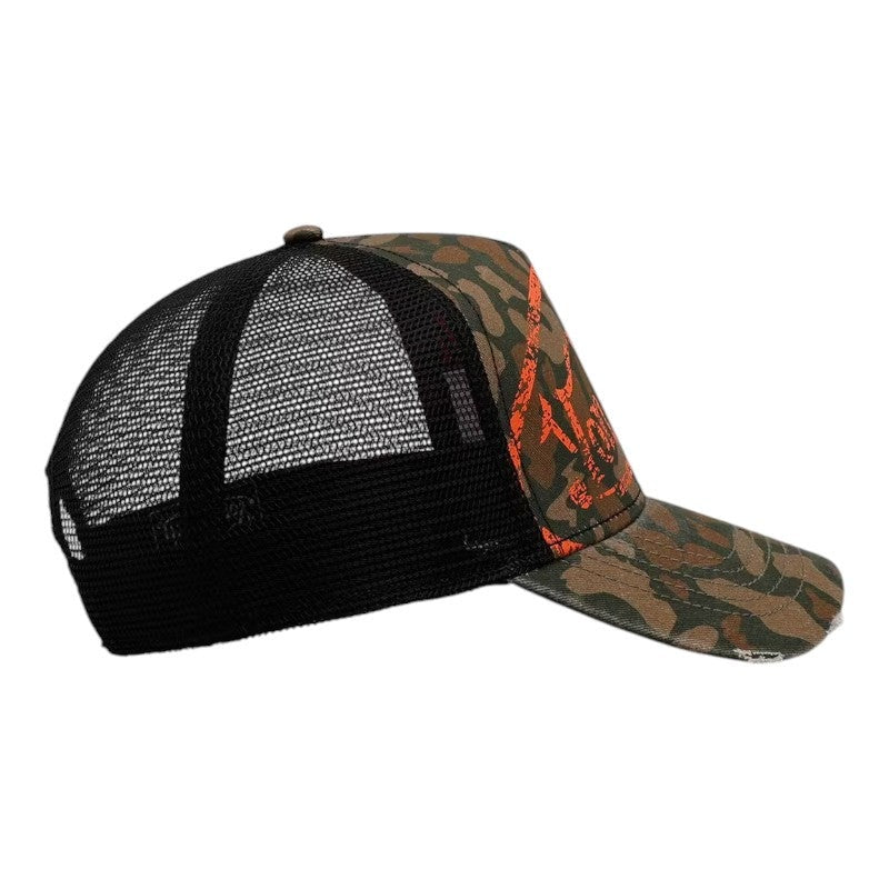 The iconic Von Dutch Trucker Cap, reimagined in bold camo and striking orange. Made with a cotton twill crown and curved visor, plus breathable mesh back for that classic trucker feel. Features the VD heritage logo patches up front and an adjustable snapback closure for the perfect fit. It’s loud, laidback, and made to stand out.