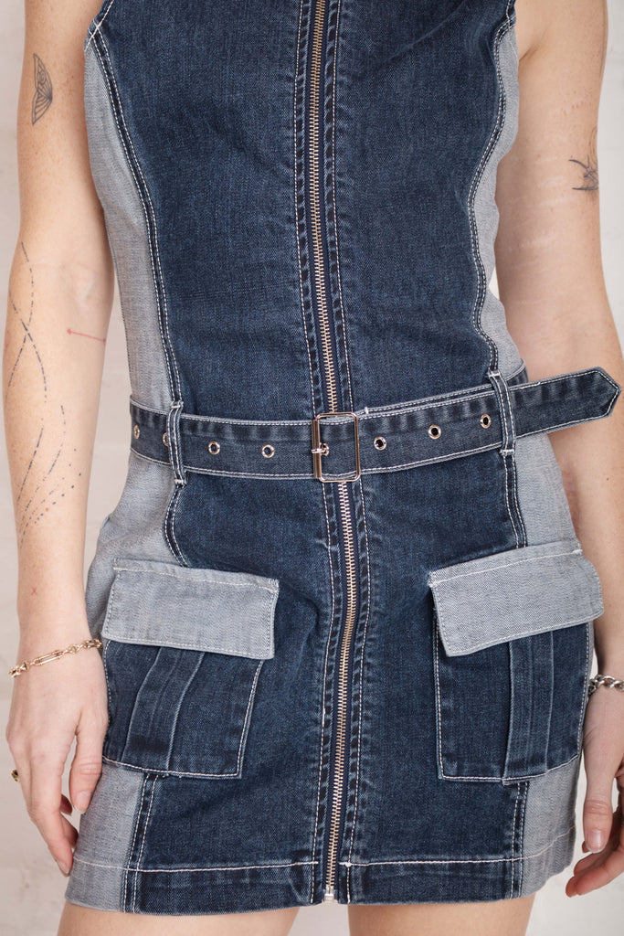 Denim mini shift dress in mid blue denim with contrast side panels and pockets. Featuring an eyelet detail belt