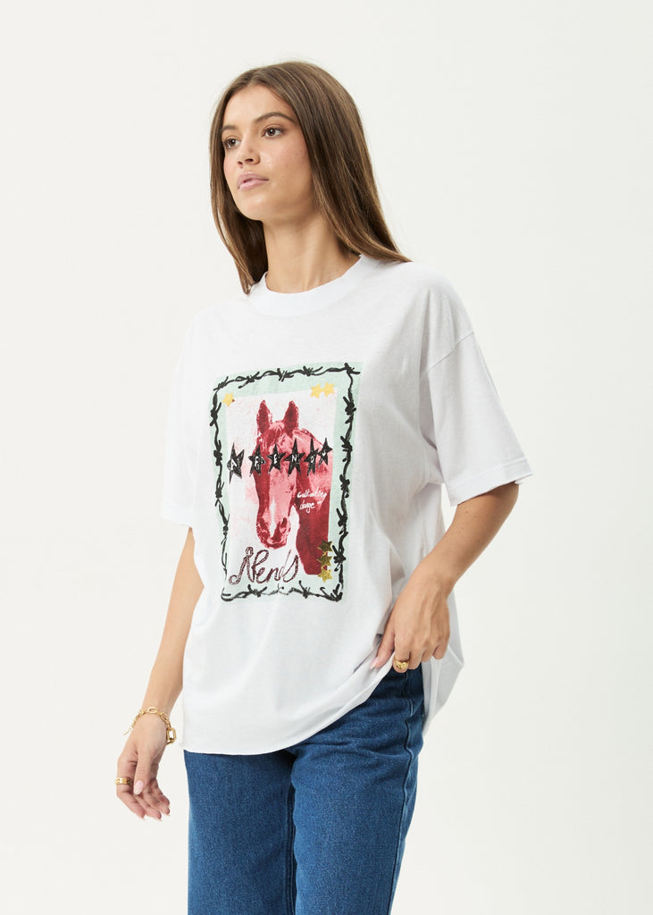We’re embracing an ongoing coastal cowgirl theme - a fusion of our laid-back AFENDS coastal streetwear roots with western cowgirl aesthetics. The 'Horsegirl' oversized tee is made from a hemp cotton blend for breathability and comfort. Designed with an oversized fit, ribbed crew neckline, double raw-edge hem, and screen printed artwork.