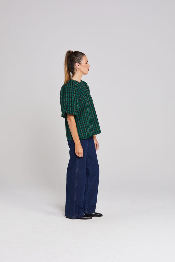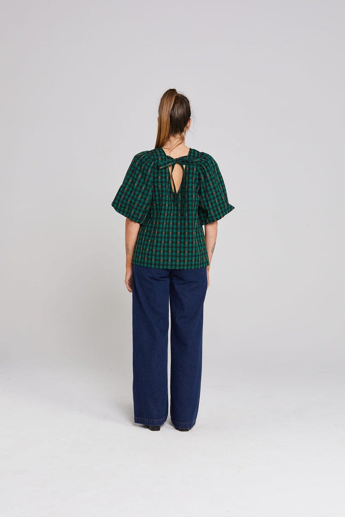 This is the Lucie Top. She loves long lunches, high teas and cocktail hour. She has voluminous puff sleeves and a self fabric bow in the back.