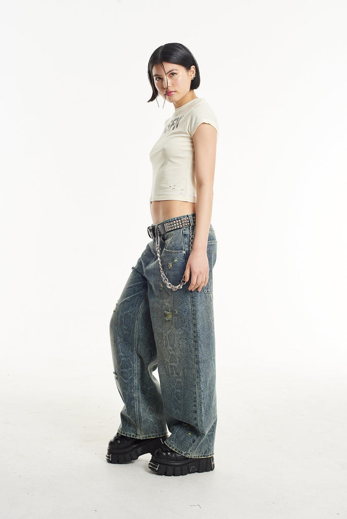 Slim Sweeper jean in super distressed snakeskin print