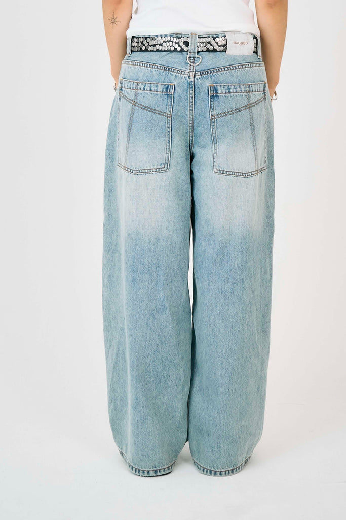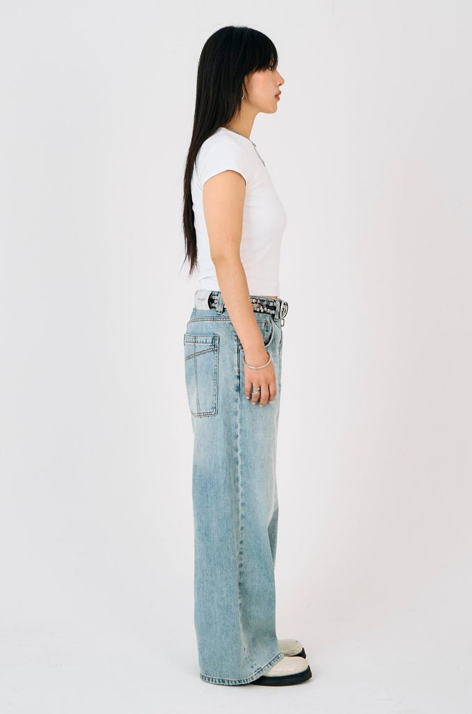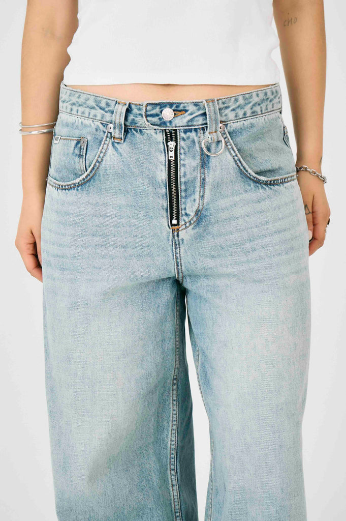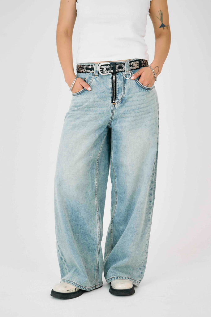 Slim Sweeper jean in vintage light wash with zip front and silver D ring hardware